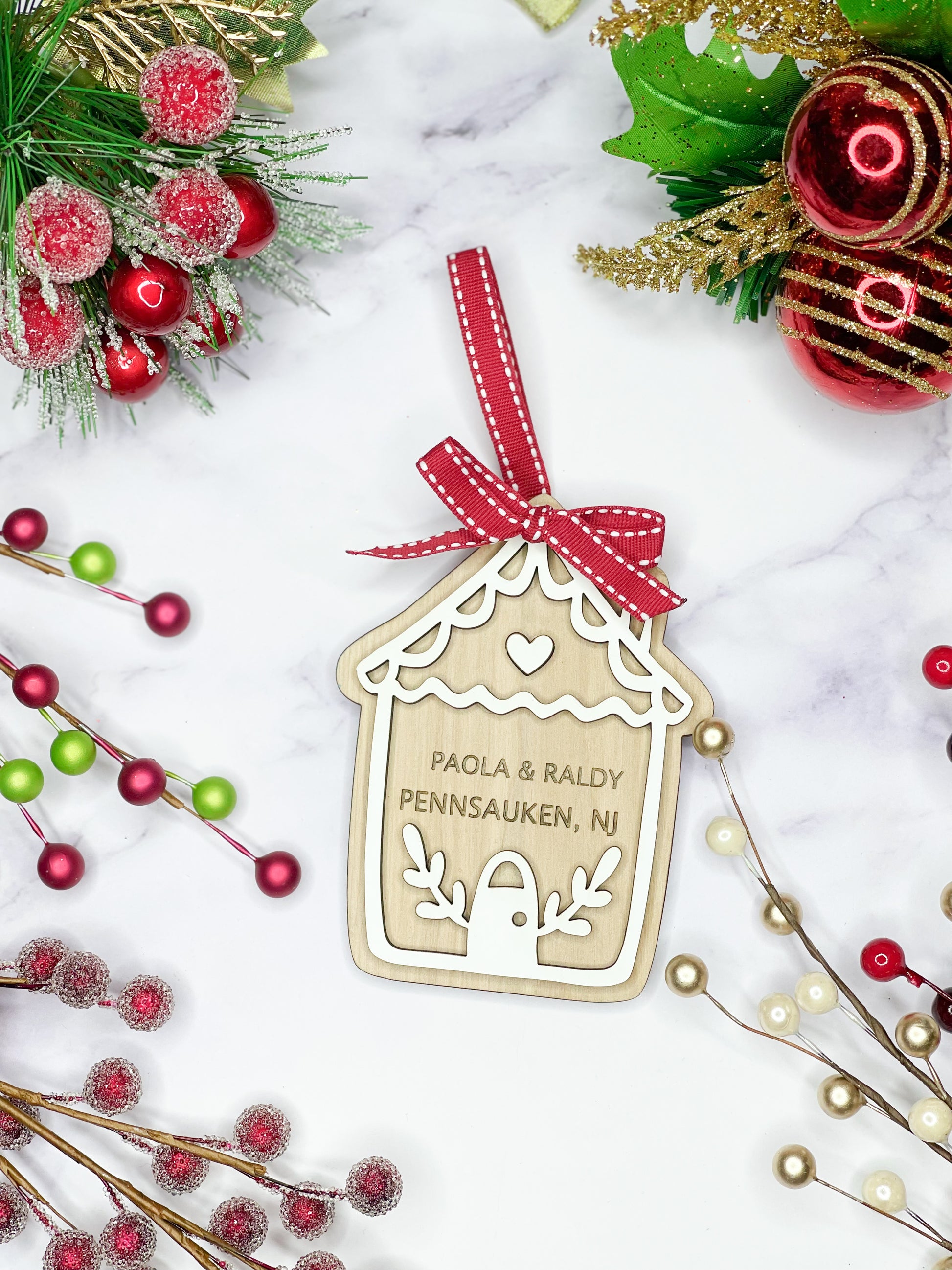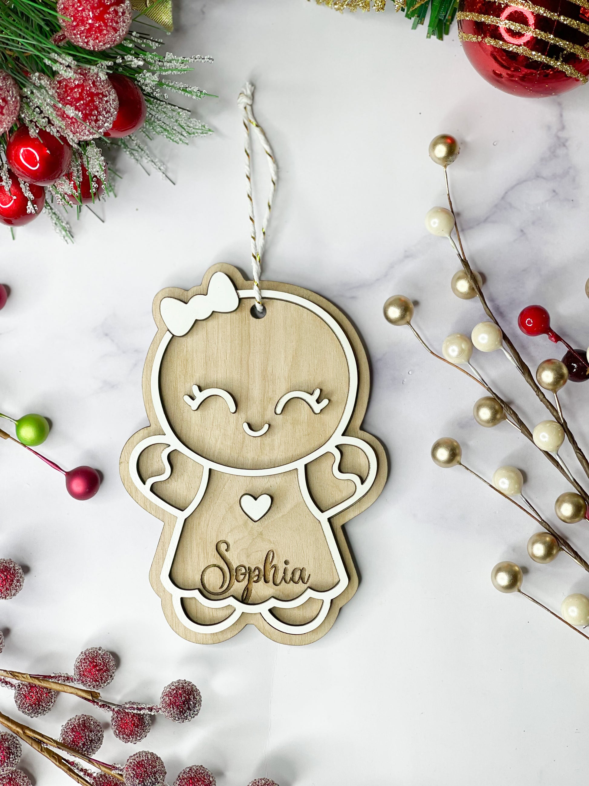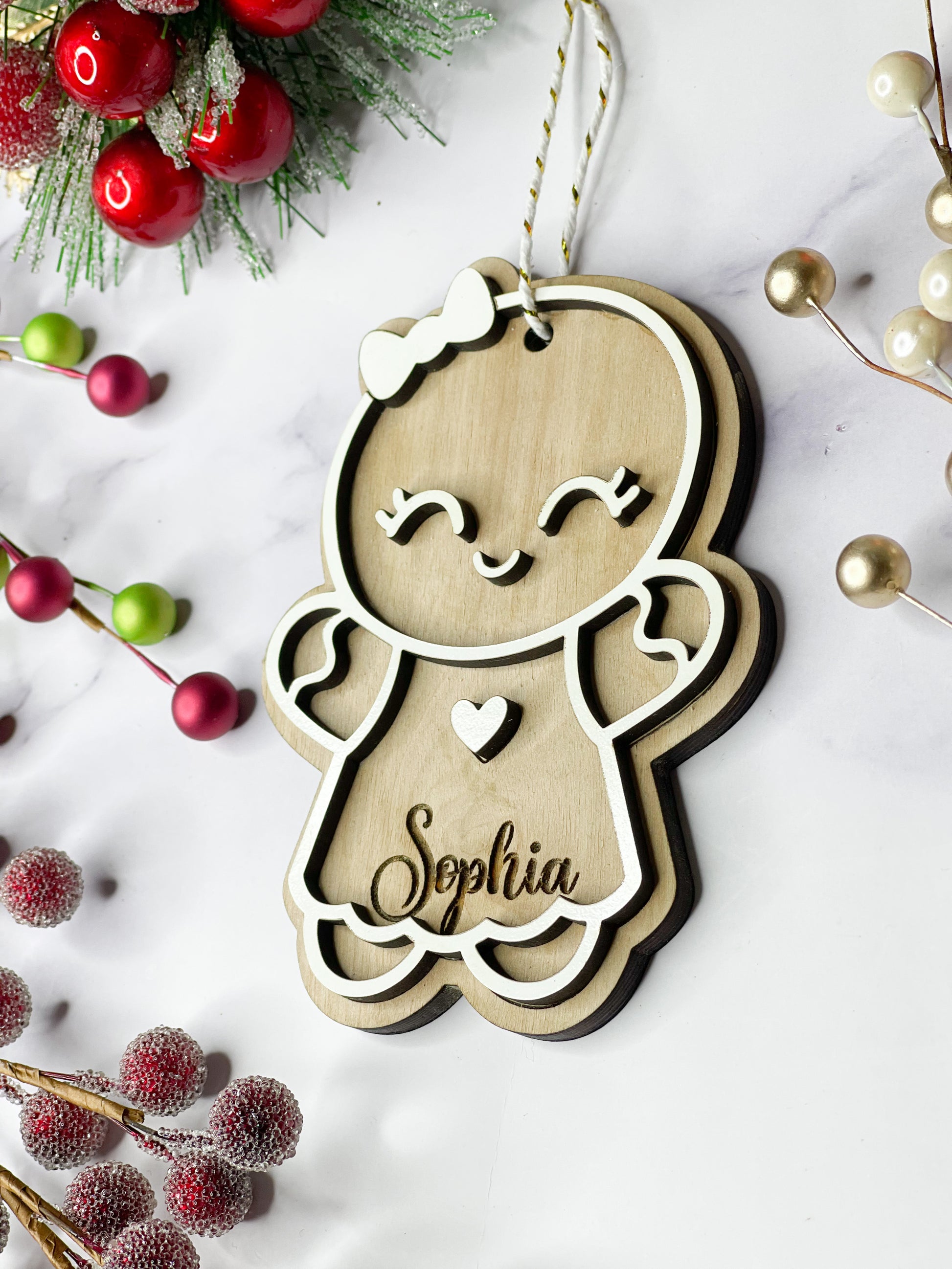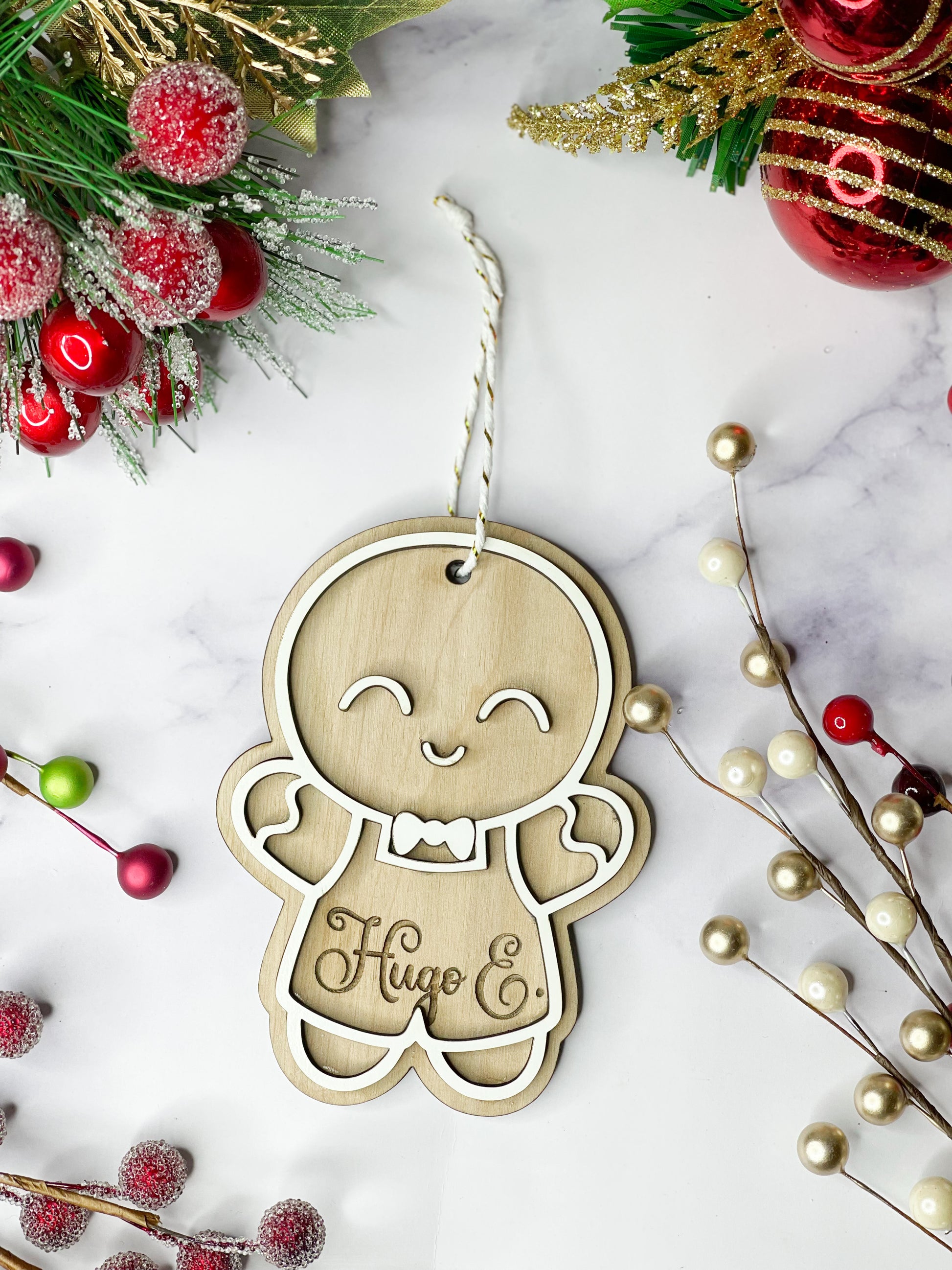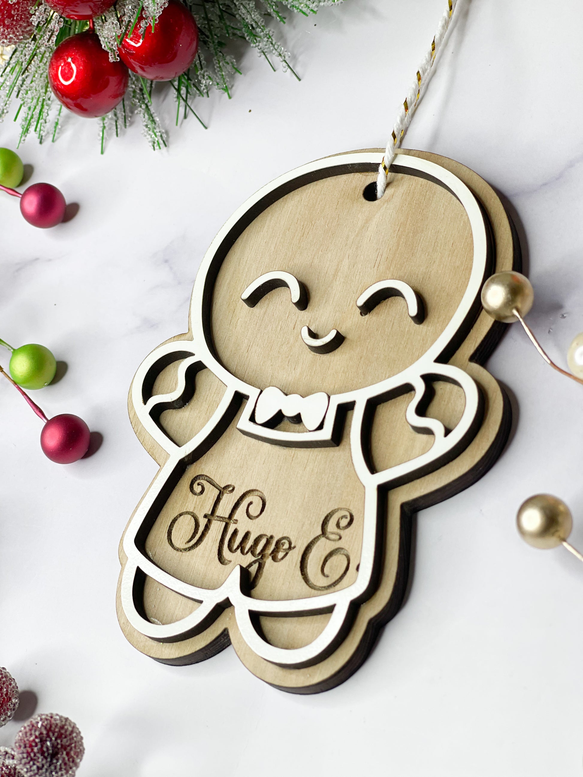 • Double stacked ornament to provide a unique 3D appearance! Backing is cut from 1/4 wood and stained, top is 1/8 and painted white to give realistic gingerbread cookie look!