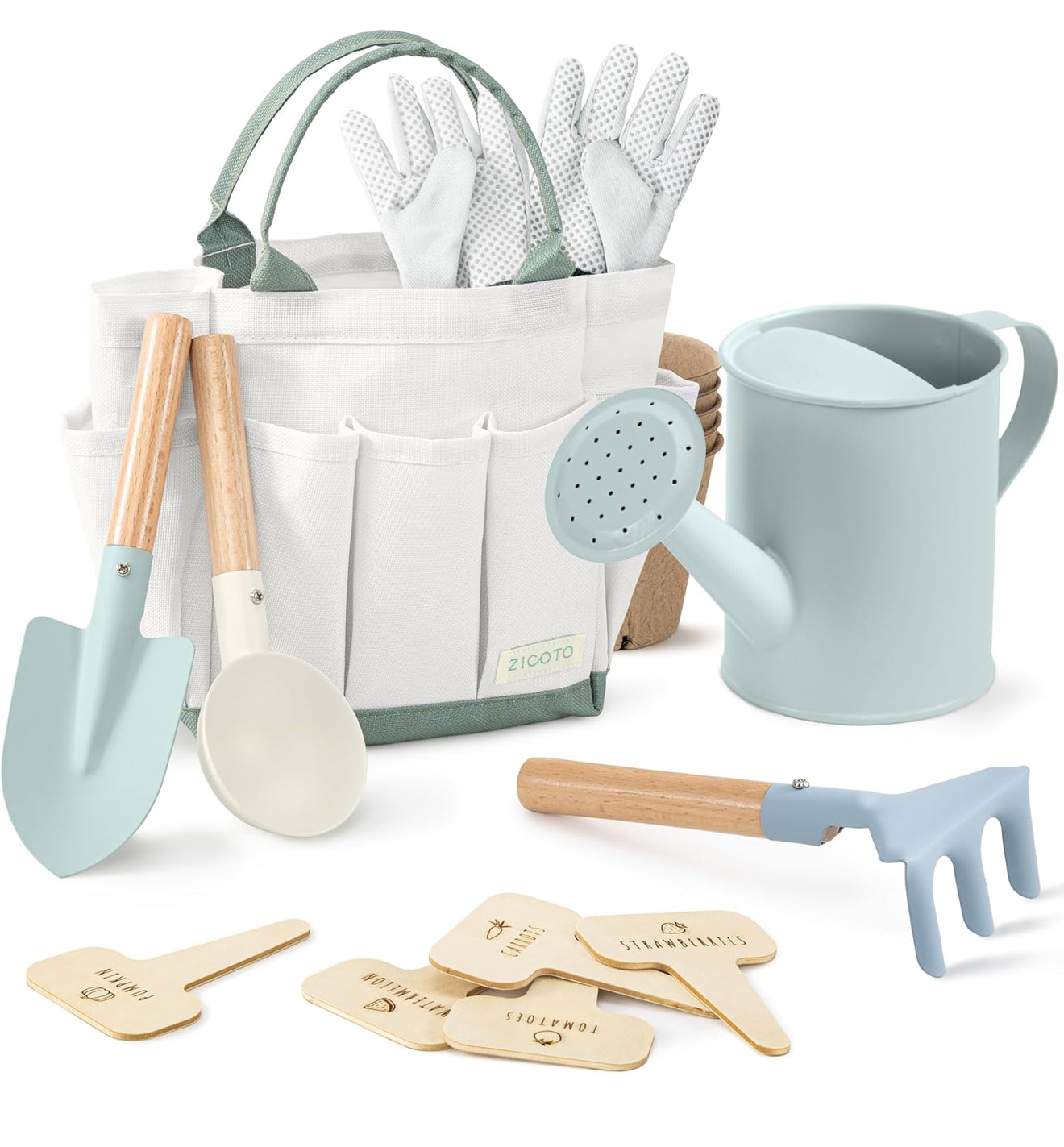 The set includes kid-friendly tools like a rake, shovel, trowel, gardening gloves, a child-sized watering can, 5 colorful pots, wooden plant markers, and a sturdy tote bag to keep everything organized. Safe materials and lightweight designs make it easy and fun for kids to dig, water, and care for their plants.