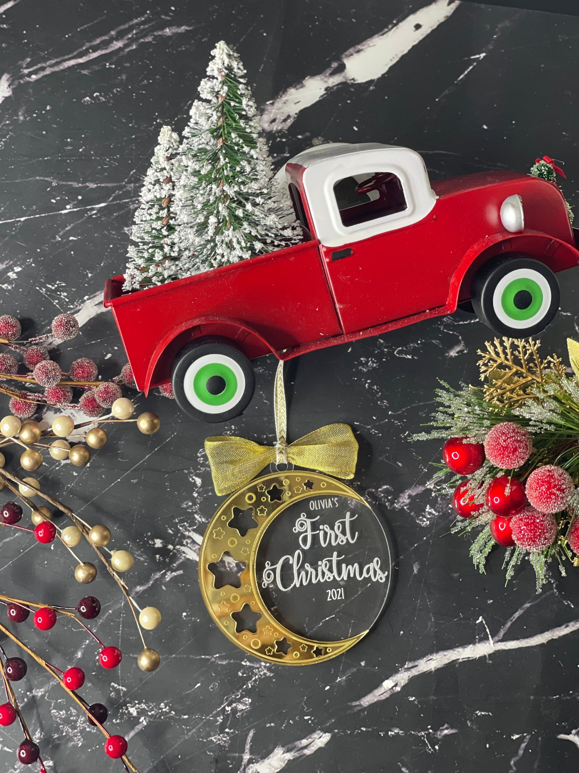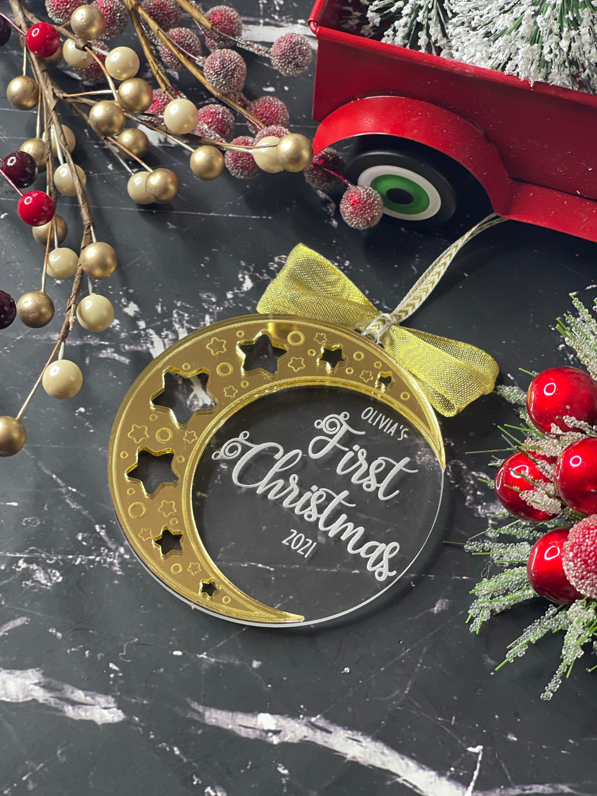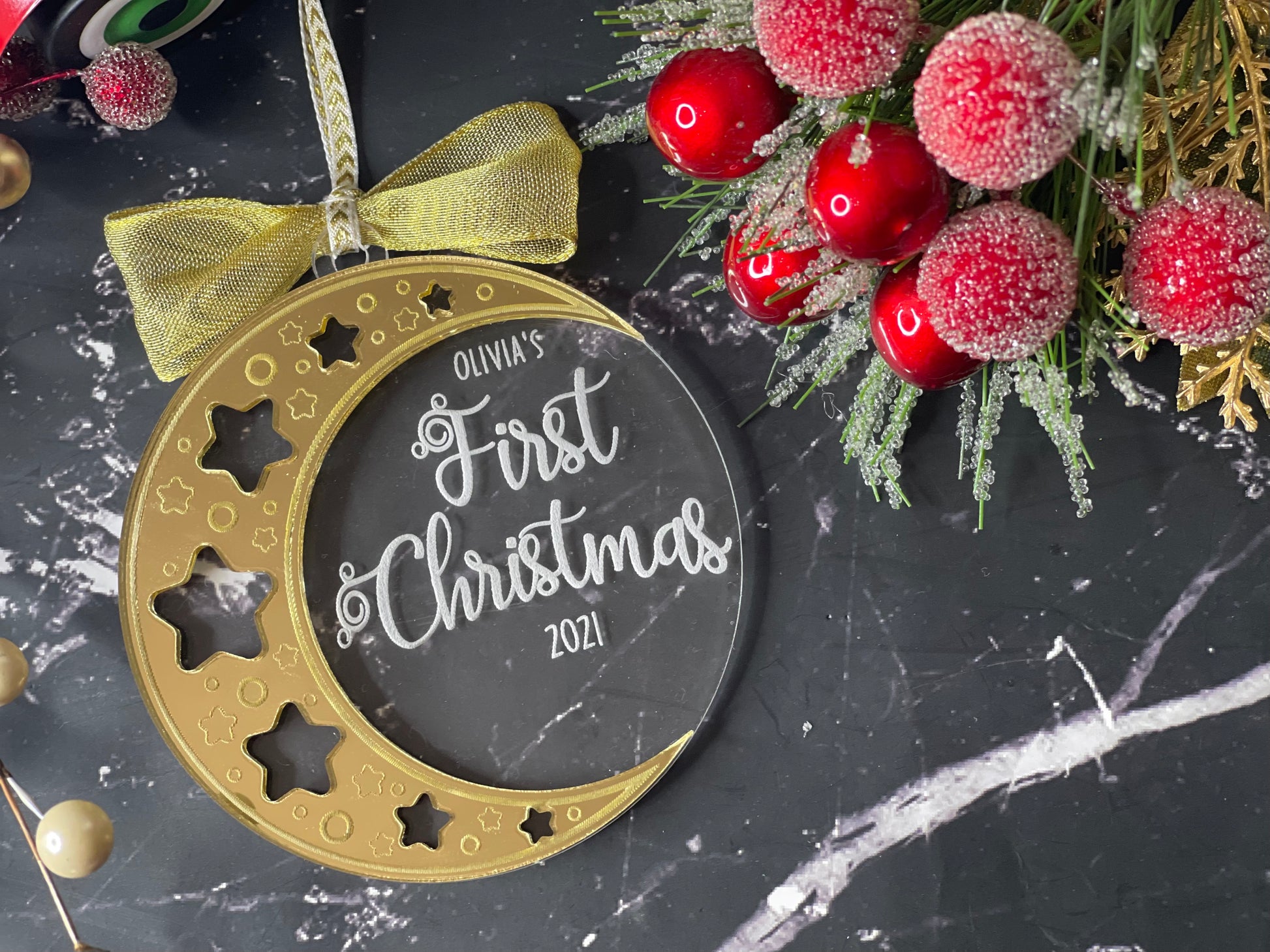 Get our custom made Baby's First Christmas Ornament, words are engraved on clear acrylic and the moon gives a 3D effect to the ornament.