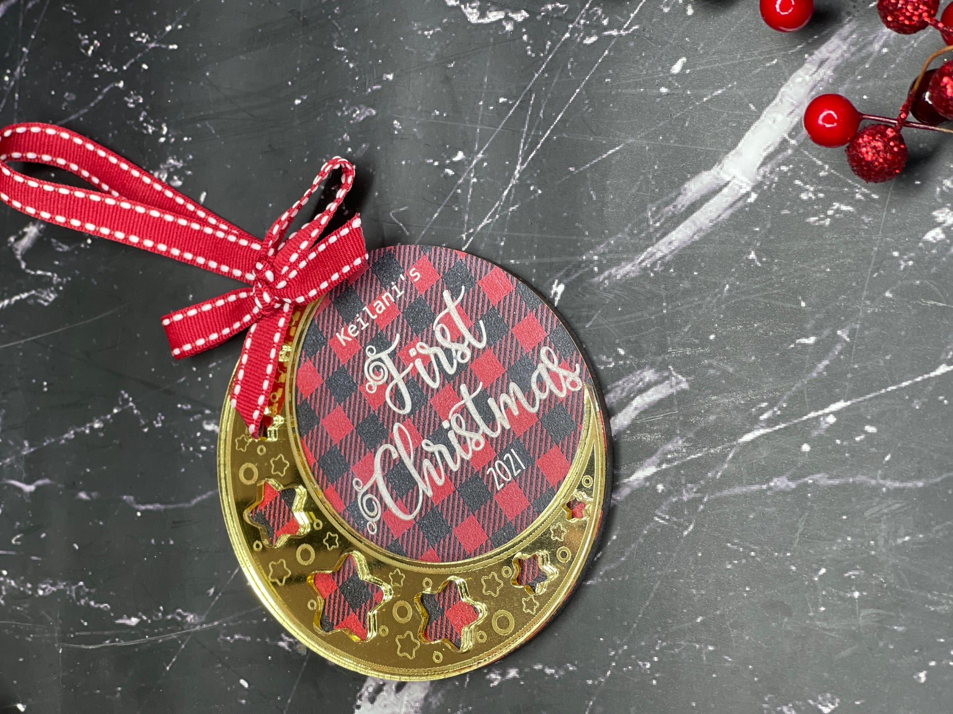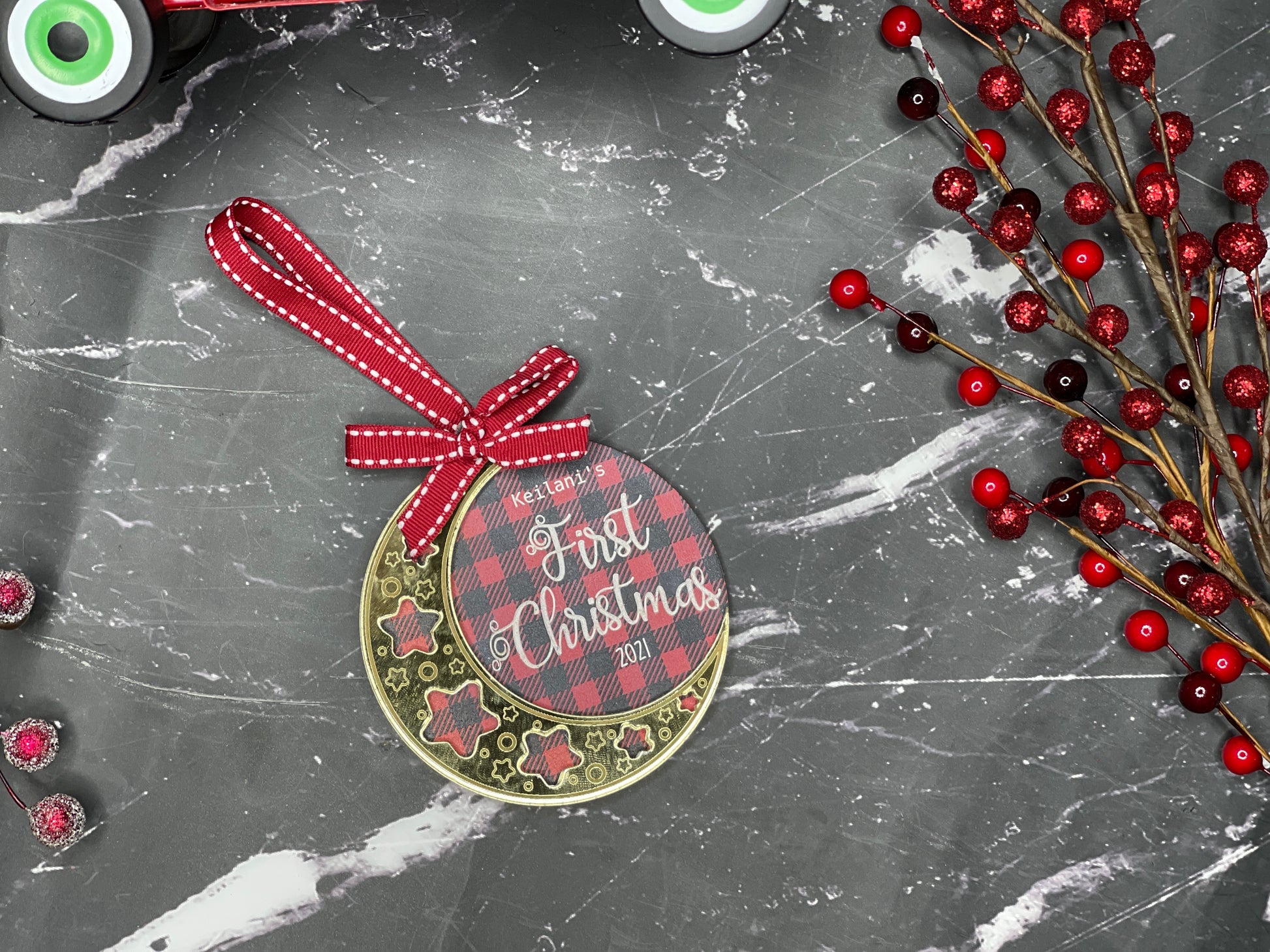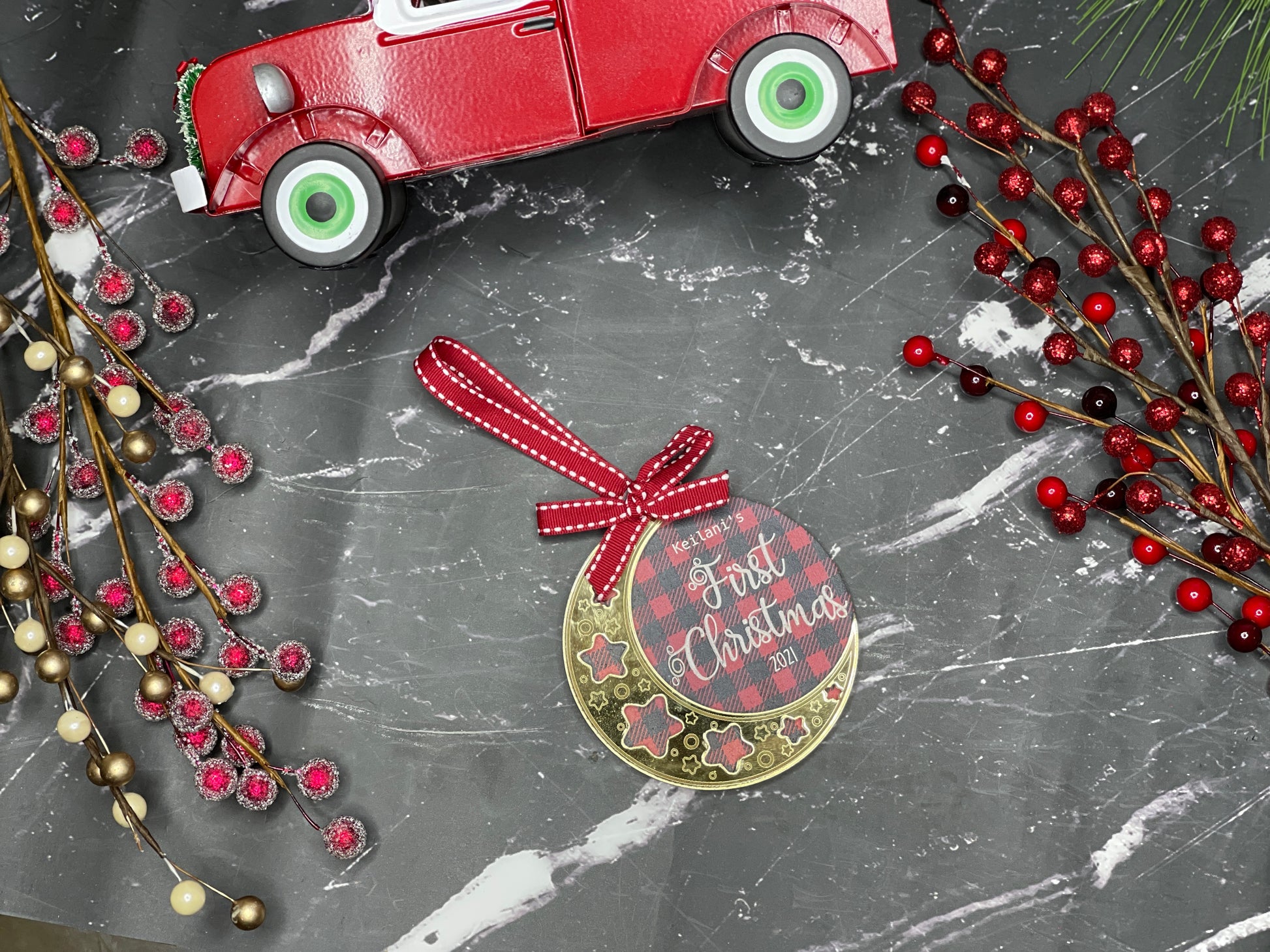 Get our custom made Baby's First Christmas Ornament, words are engraved on clear acrylic and the moon gives a 3D effect to the ornament.