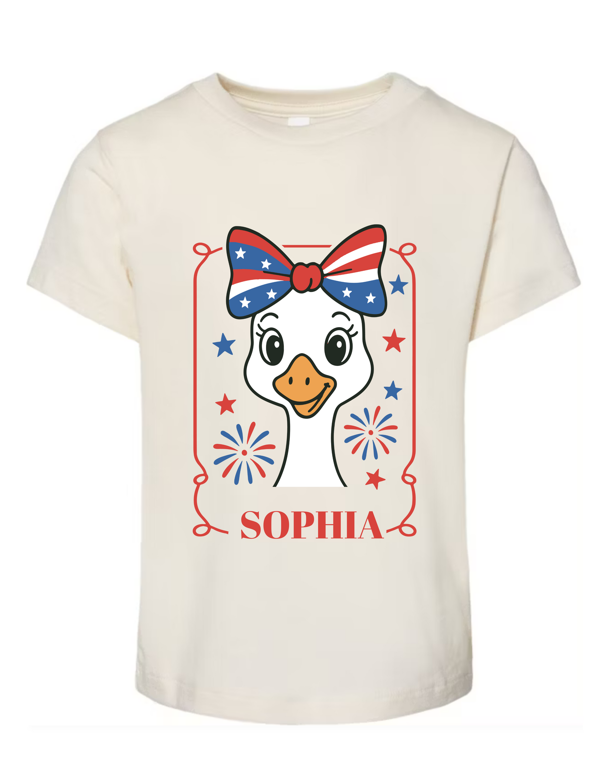 This adorable toddler t-shirt features a sweet goose with a patriotic bow and your child’s name printed below — a perfect look for BBQs, parades, and all your festive family fun.
