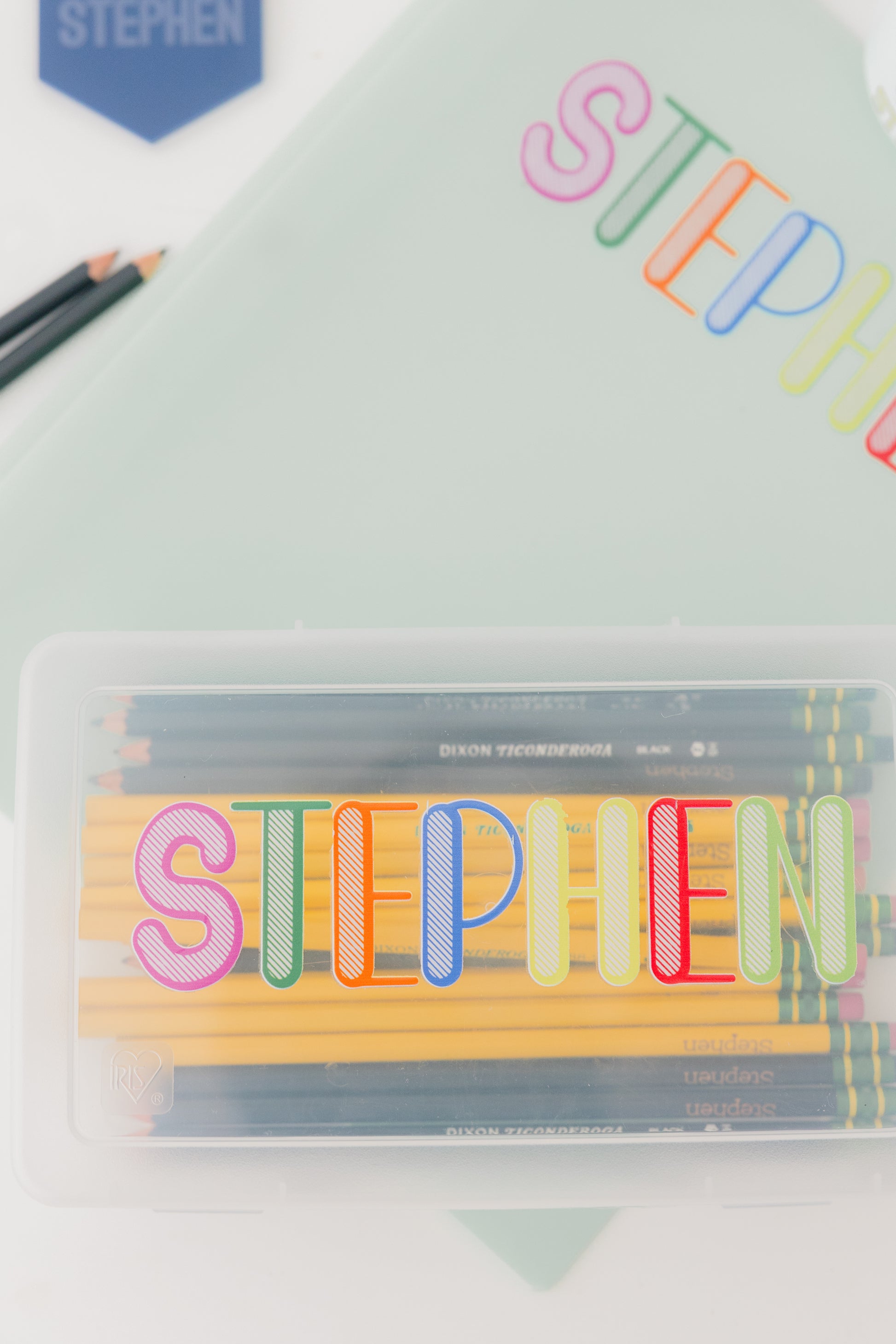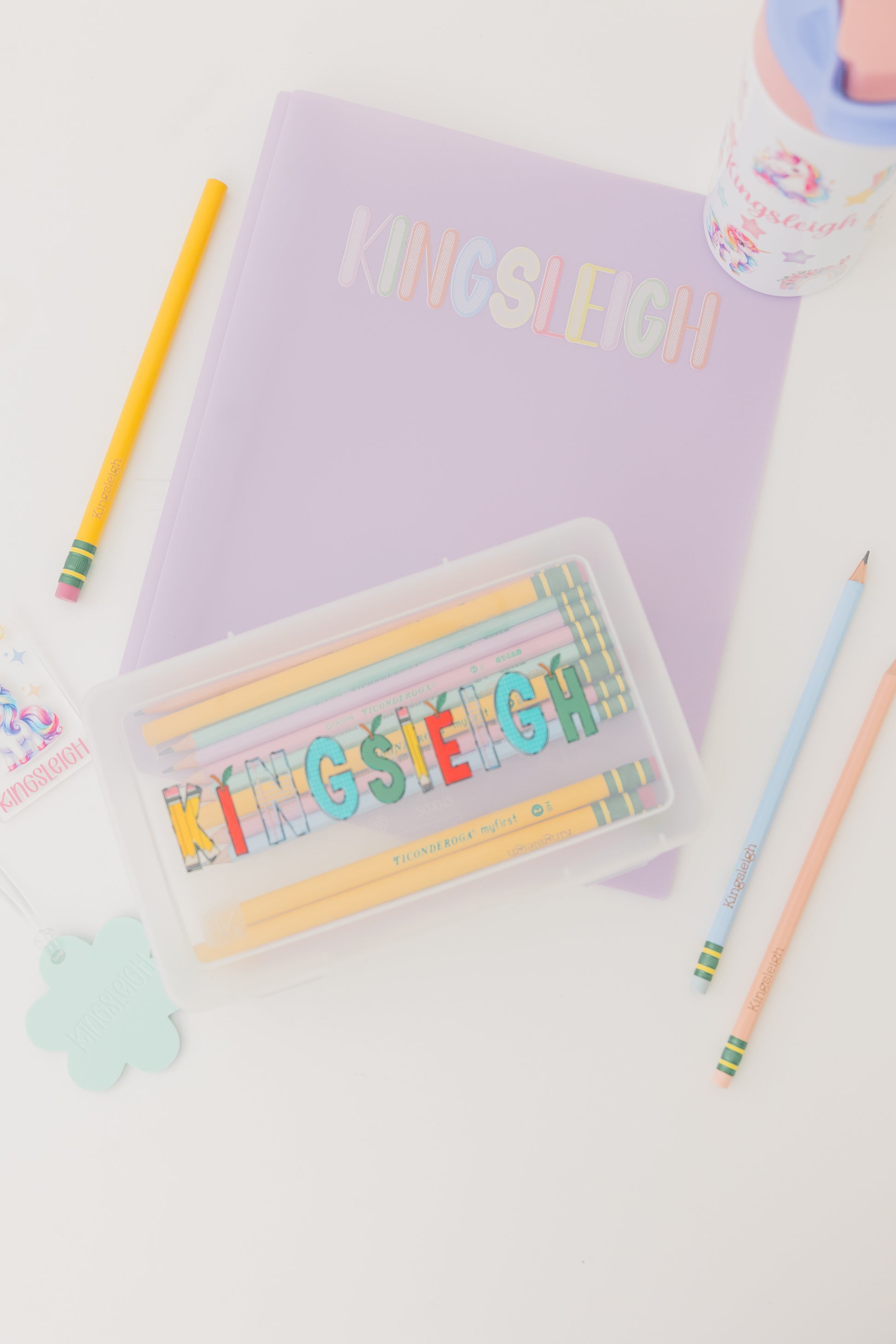 Our personalized pencil/crayon case is perfect for Back to School, daycare, or home learning. Each box is customized with your child's name in your choice of three fun fonts, and matches perfectly with our full Back to School collection!