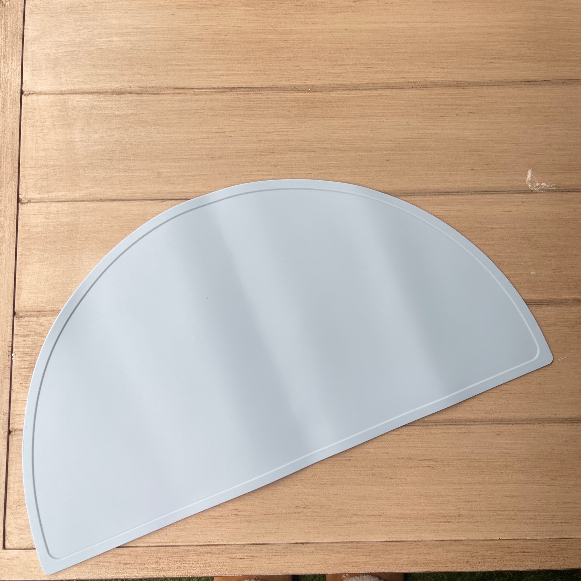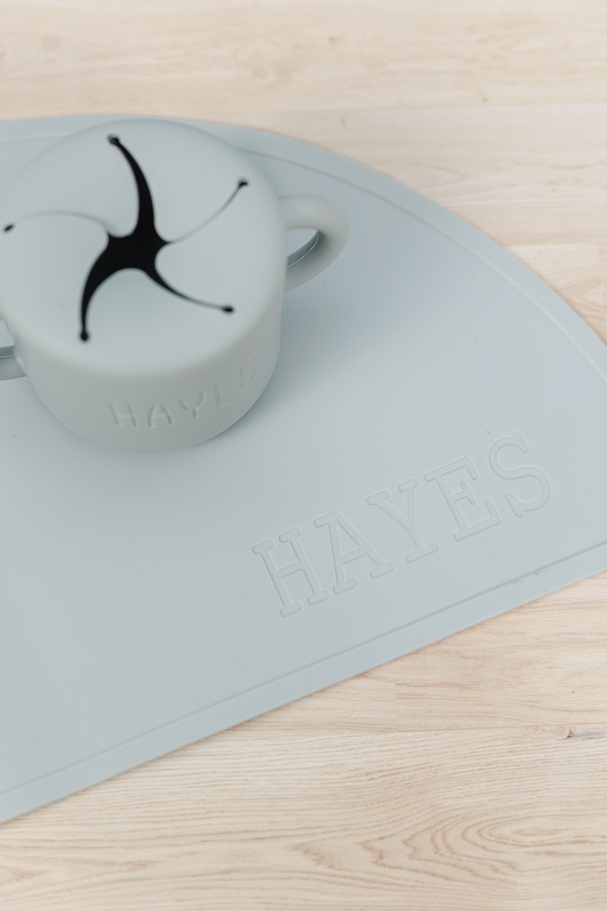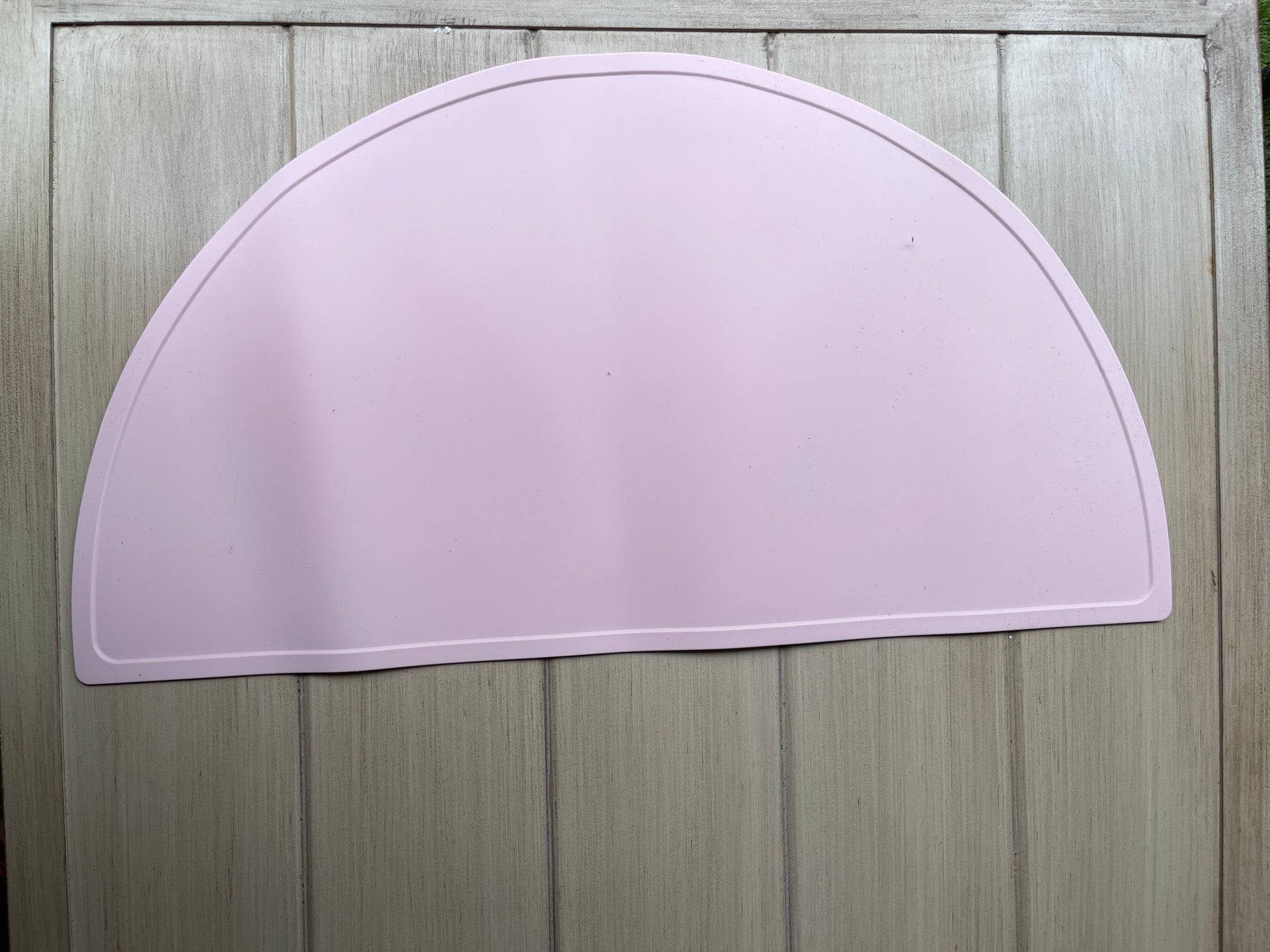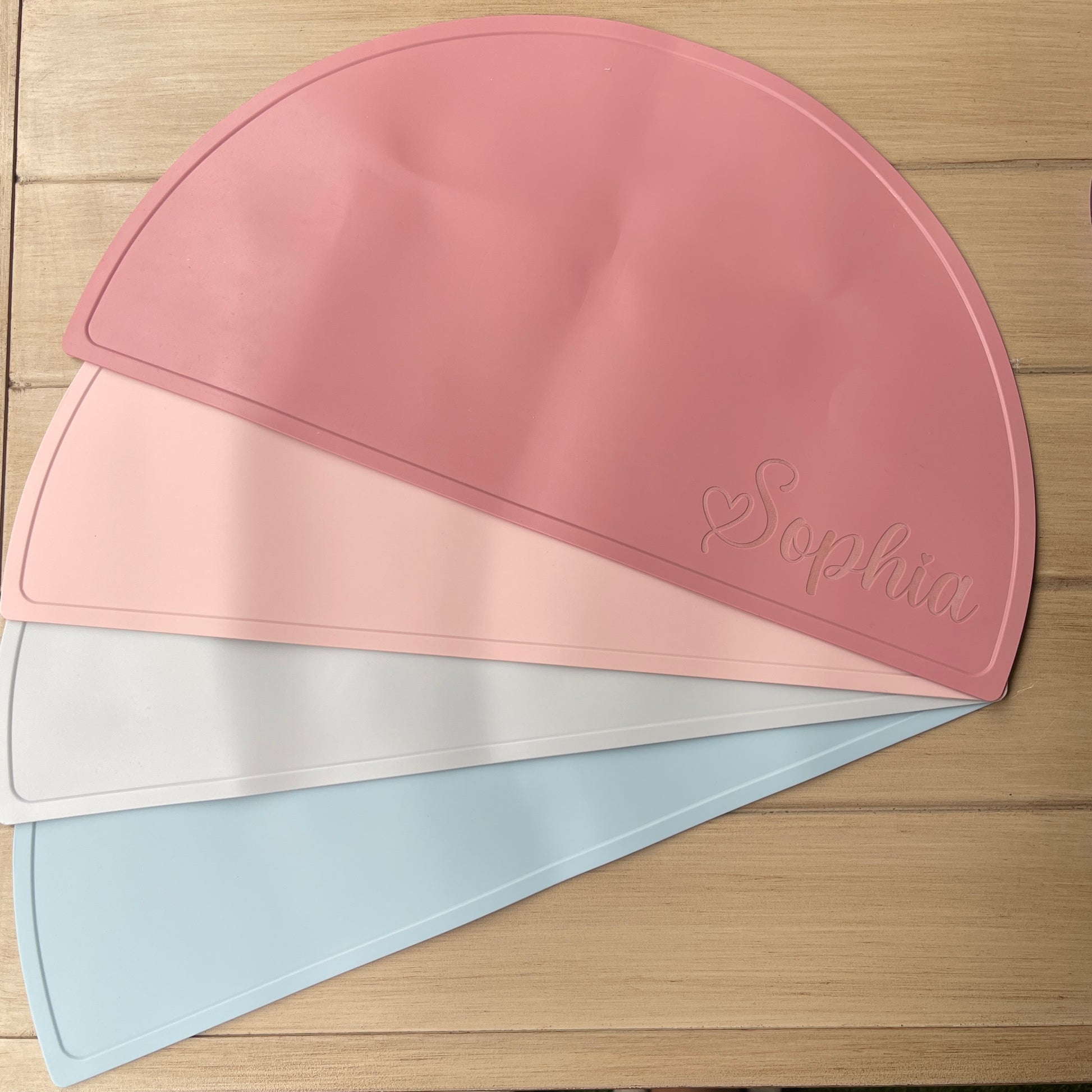 This personalized placemat keeps your table, high chair or restaurant table mess free while baby eats! Maintains a clean environment so baby’s food does not touch the restaurant table, picnic table or anywhere you find yourself eating. Small enough to roll up for easy storage in a wet-dry bag, Ziploc bag or diaper bag, while still maintaining a large enough surface to cover the average eating area of a baby/toddler table. The bottom of the mat is a semi-slick surface that will stick to the smooth surface of most tables. Wipes clean when you are done!