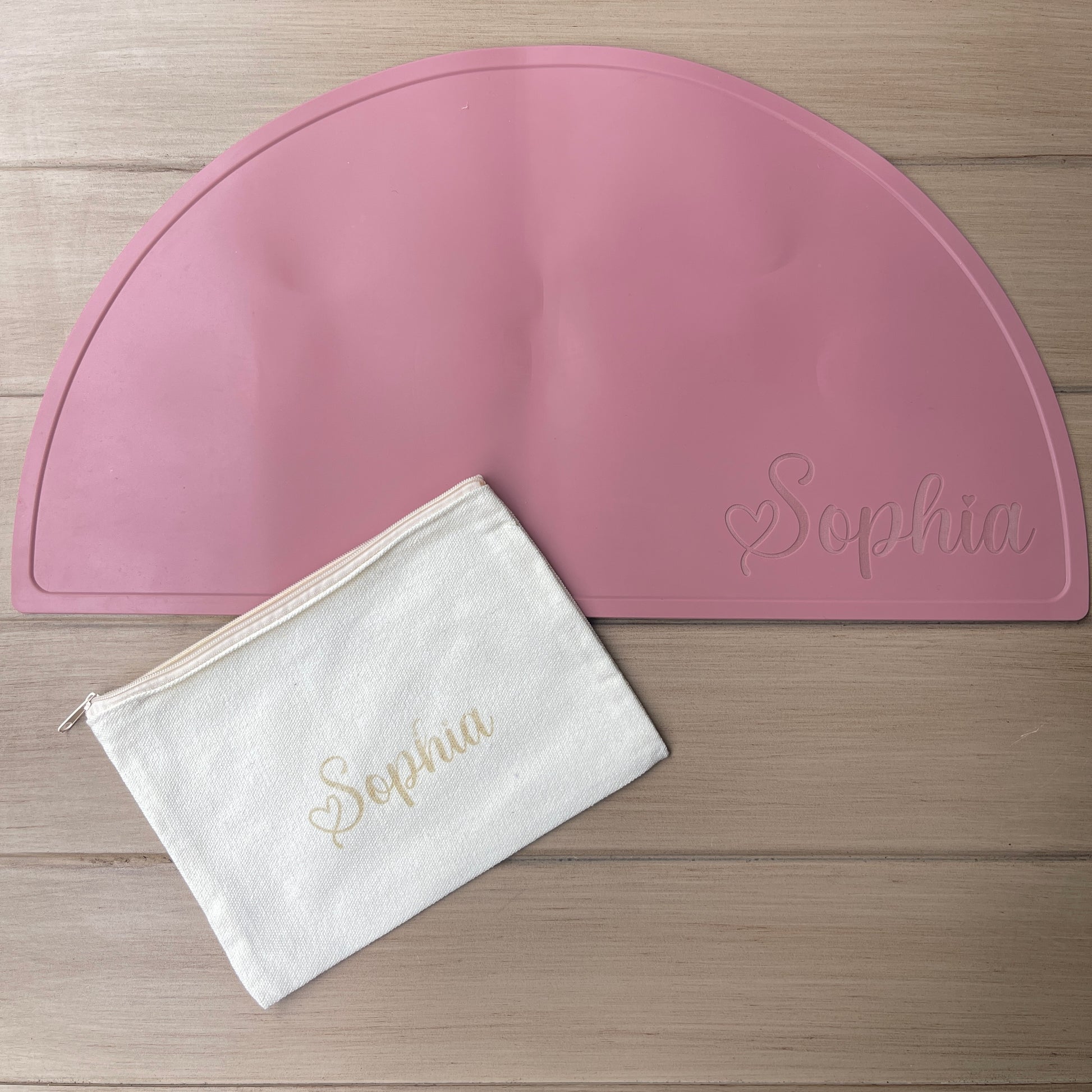 This placemat comes with the little bag 7.9''x5.5'', also engraved with your kiddo name, the placemat and the bag will be engraved with the same name.