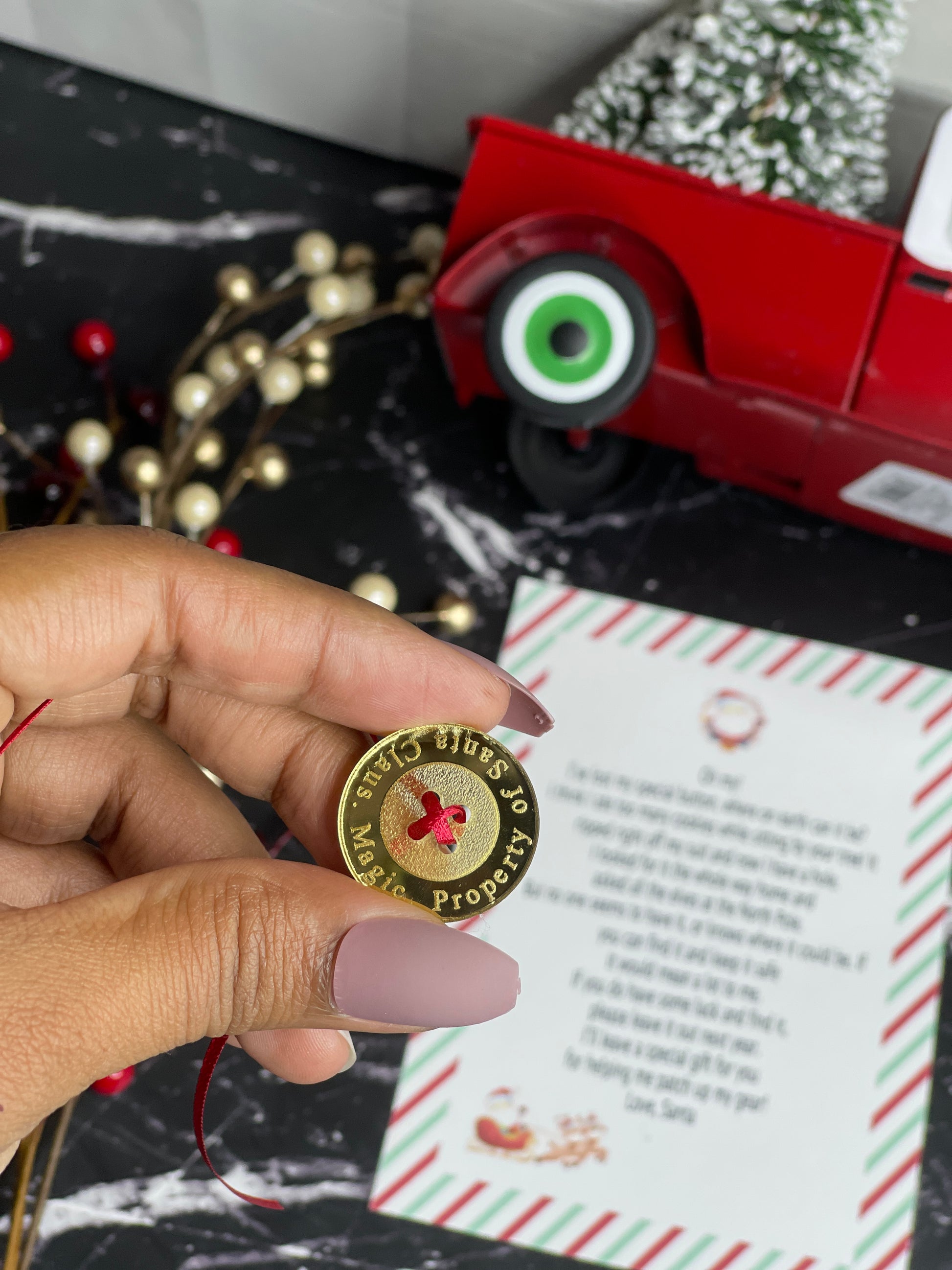 Rumor has it that sometimes, Santa's coat buttons come loose and fall off when he's delivering presents to children. Don't ask how I know this, but the delight on kids' faces when they find this magical charm by the fireplace is unforgettable! The magic of Christmas is truly in the air, and just like the bell from the Polar Express, this button makes children believe. With a little extra string, your button can easily be turned into a special ornament to hang on your tree for years to come.