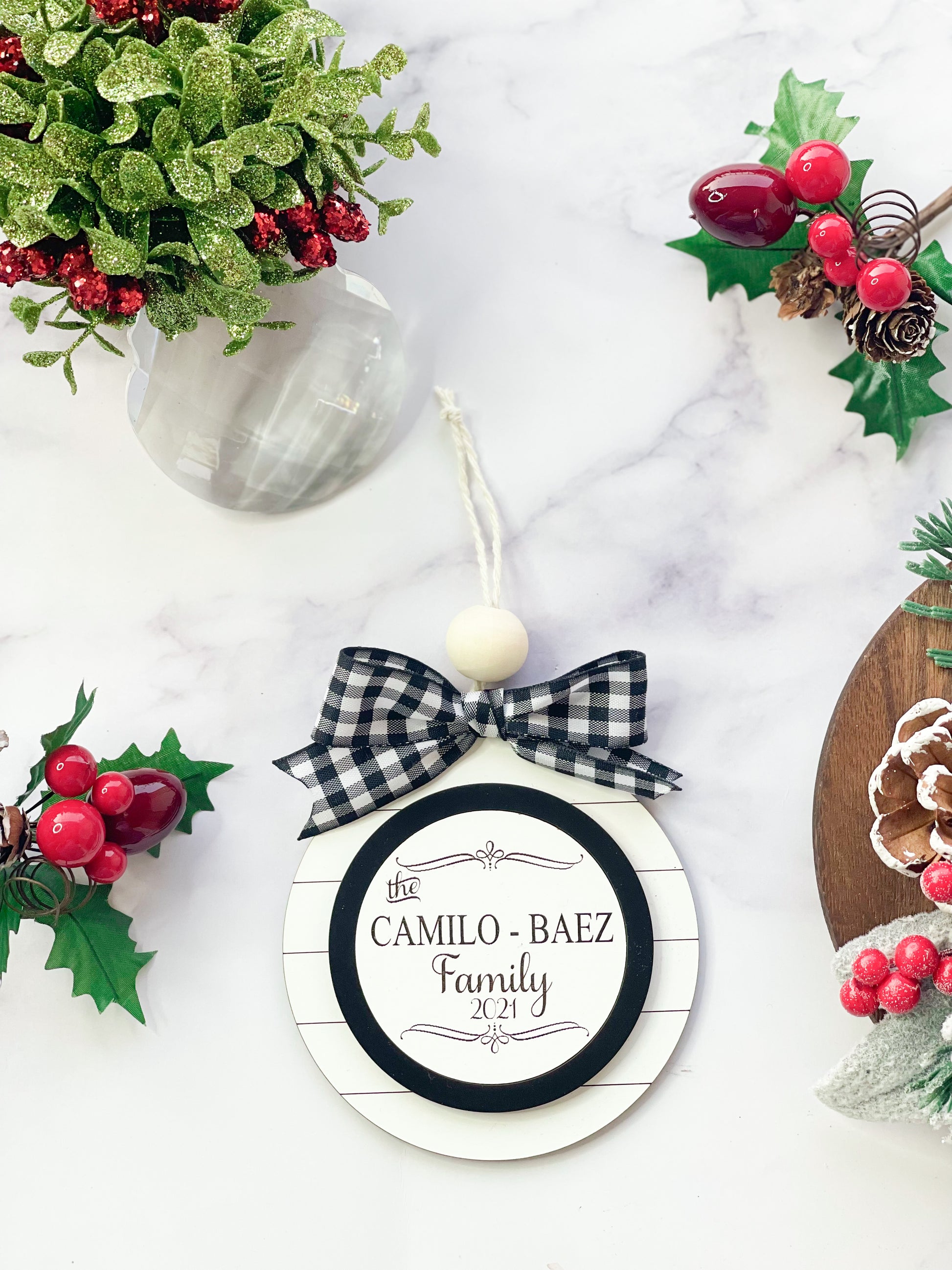 Each ornament includes a black and white buffalo plaid bow, twine and one natural beads.