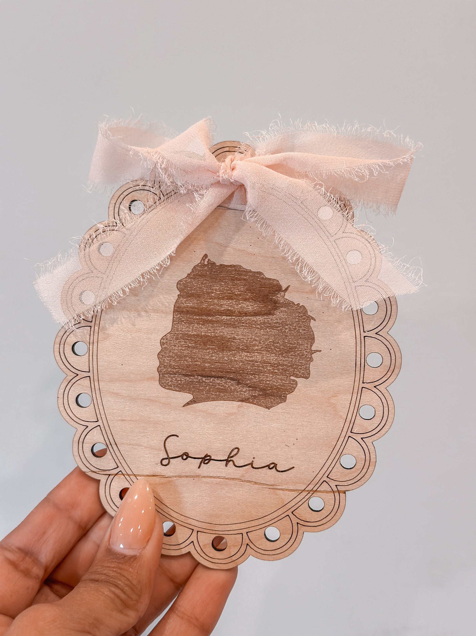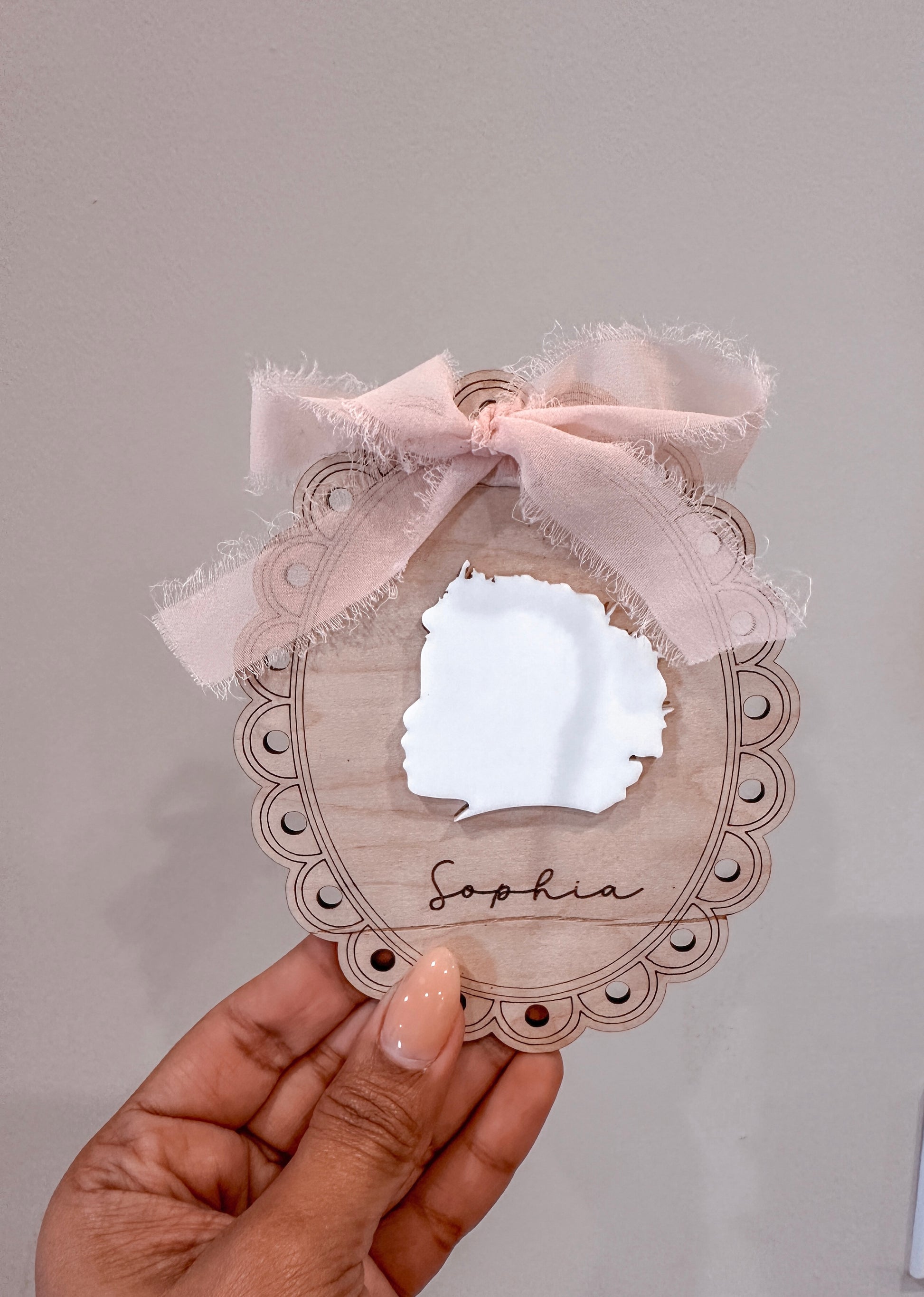 Introducing our exquisite portrait silhouette ornament, measuring 5.5 x 4.5 inches. Crafted with precision, it offers two options: engraved detailing or a delicate silhouette cut in acrylic. Simply provide your desired image, and we'll create a timeless keepsake for you. After purchase, email your picture to craftinbyraquel@gmail.com. Capture cherished memories with elegance and style.